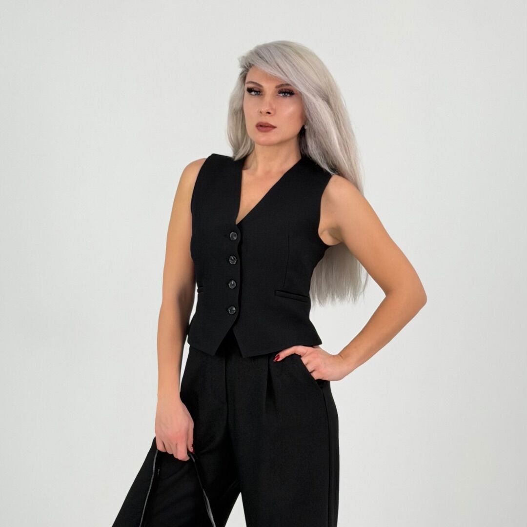 Modern ve zamansız tasarımıyla öne çıkan siyah yelek güçlü ve şık bir duruş sunar.
