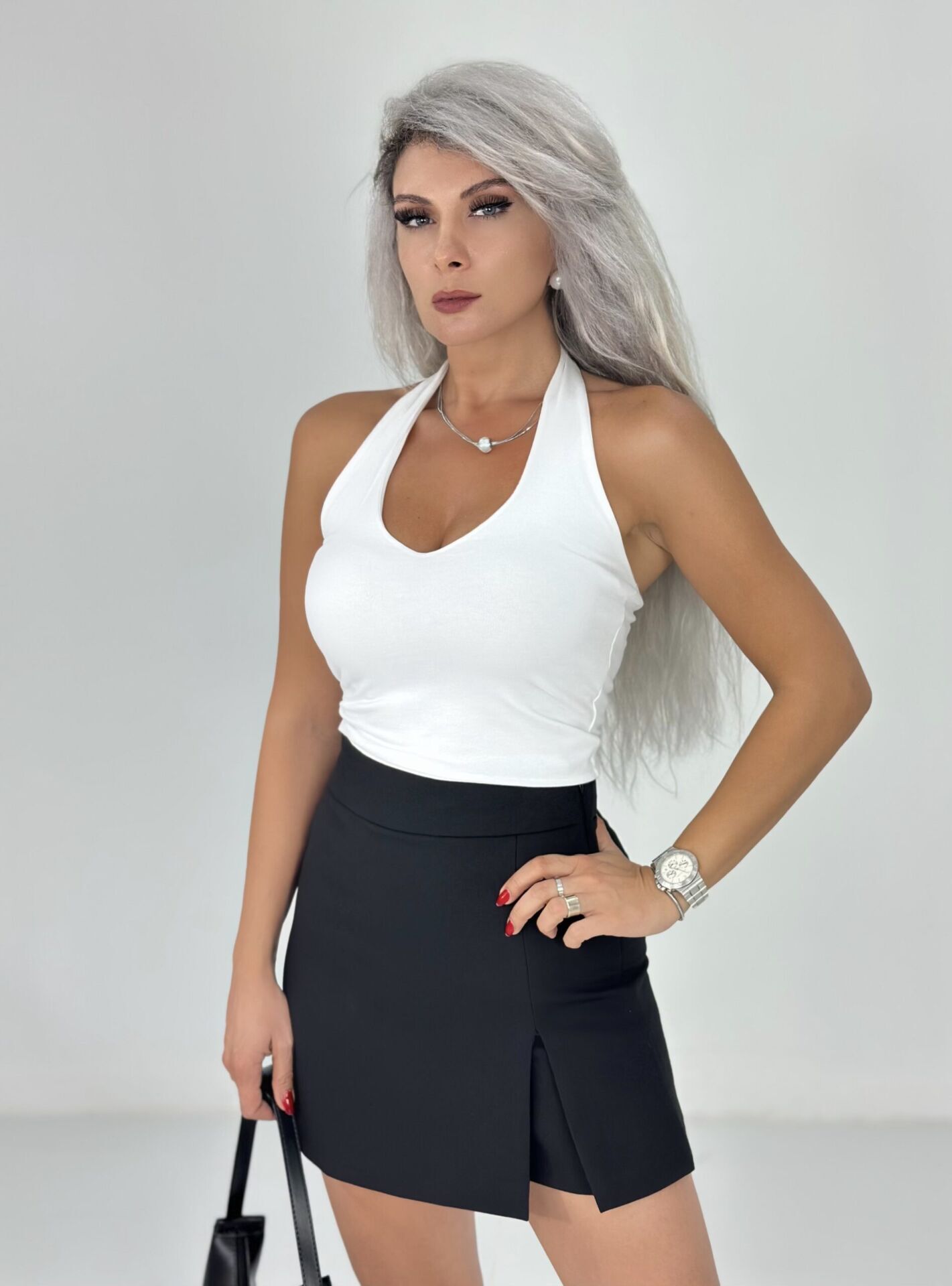 Siyah Yan Yırtmaç Detay Kısa Şort Etek SMALL