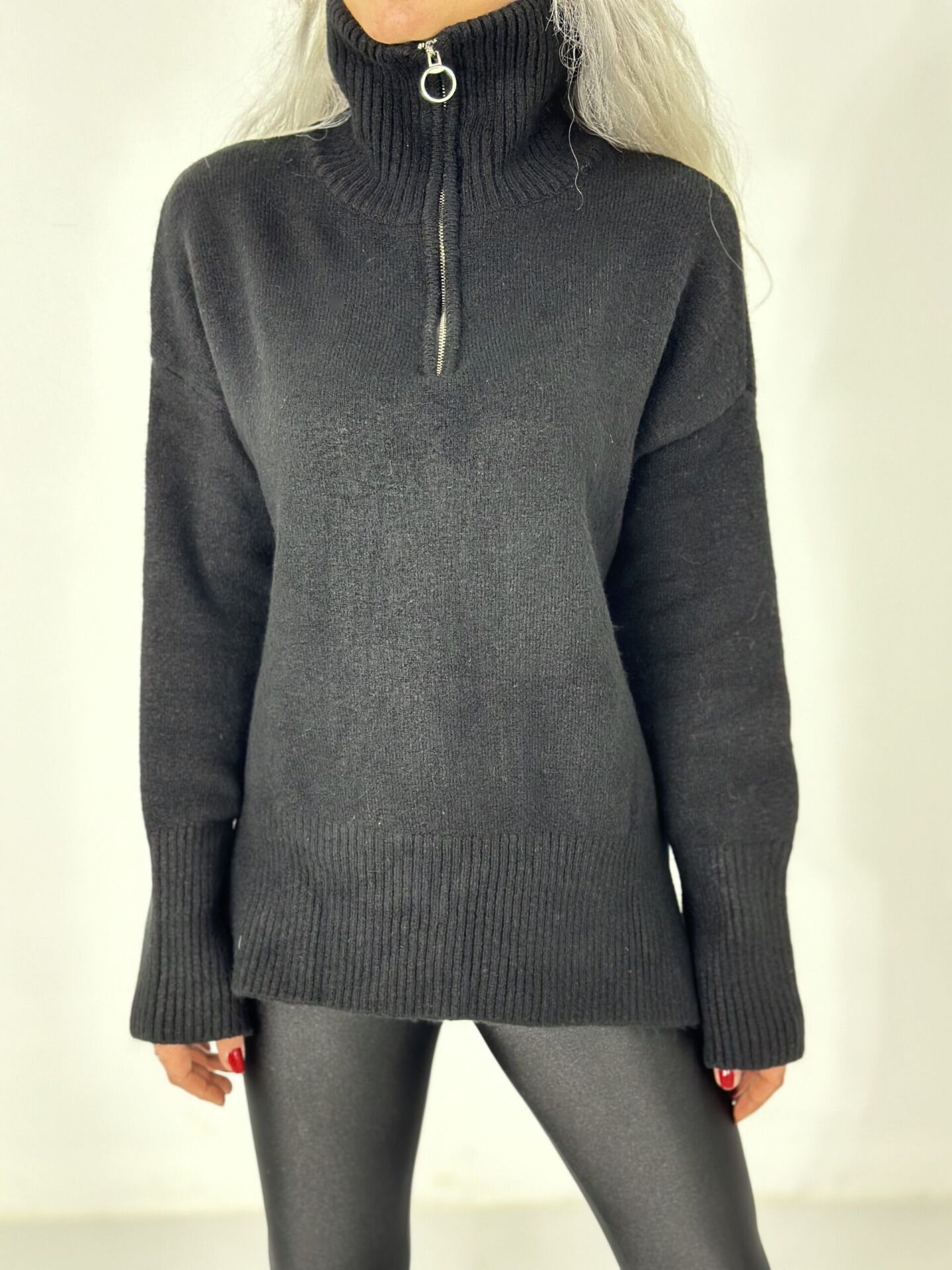 Siyah Yarım Fermuarlı Kalın Kazak