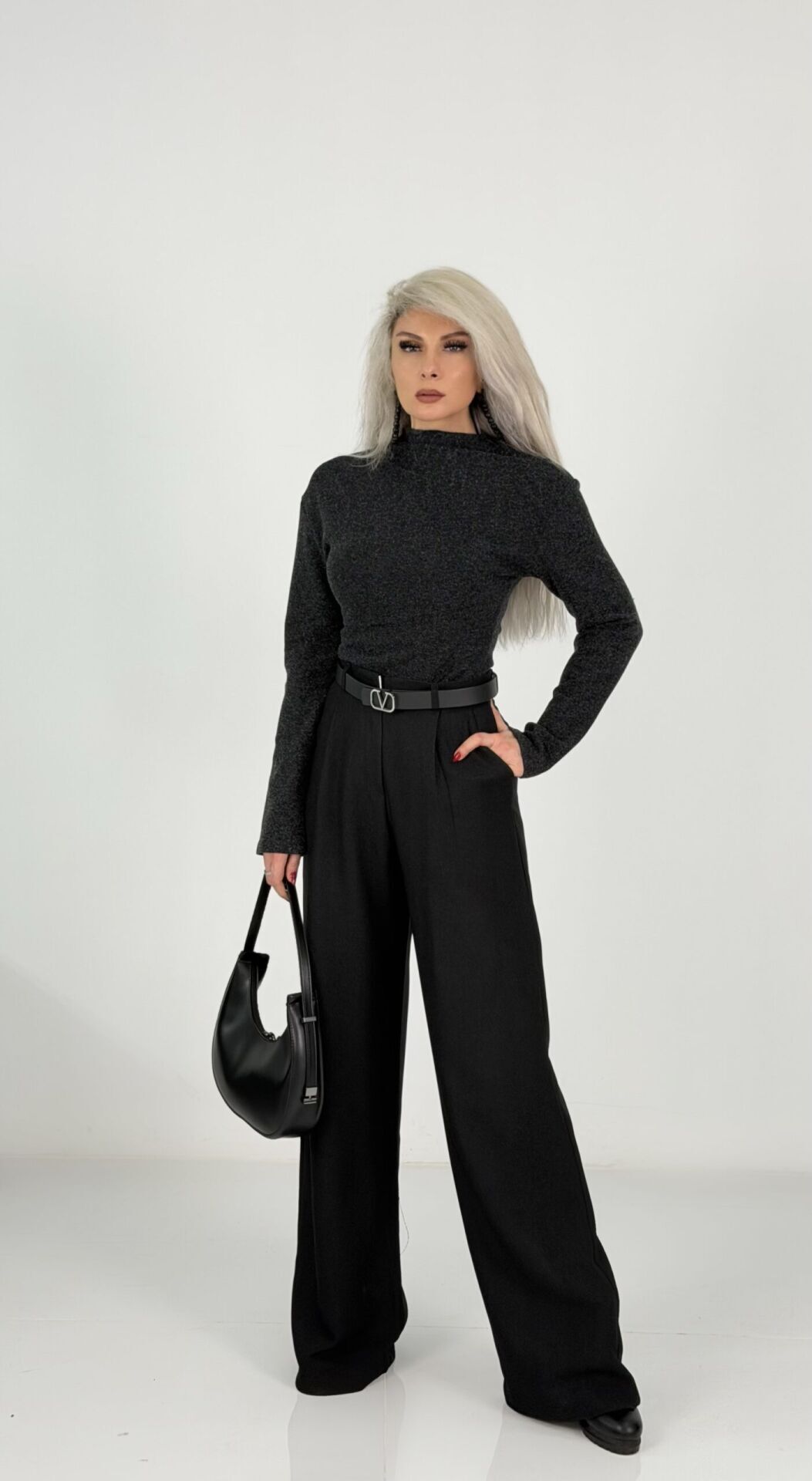 Siyah Yüksek Bel Kaşe Palazzo Pantolon
